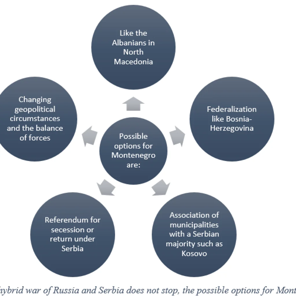 Serbia aims its returnment or the achievement of the Serbian World (Greater Serbia) in Montenegro through the model of Bosnia with federalism, the model of North Macedonia – like the Albanians, the third model is Kosovo – an association of municipalities with a Serbian majority, the fourth model is the possibility of a referendum where partial or complete union with Serbia can be requested from Montenegro and the fifth possibility is the change of favorable geopolitical circumstances leading to full scale invasion.