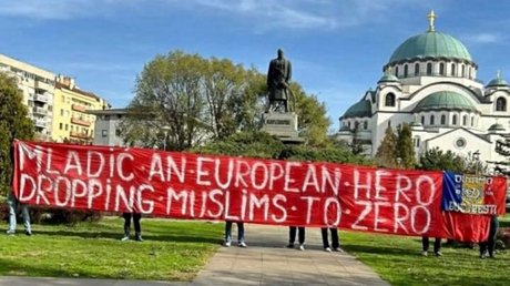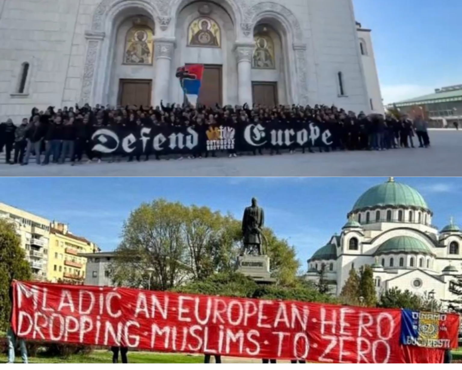 A clear example: Romanian extremists in Belgrade with a banner calling Ratko Mladic “the European hero who brought Muslims down to zero”. This is not merely provocation. It is the normalisation of crime under the guise of civilizational justification.